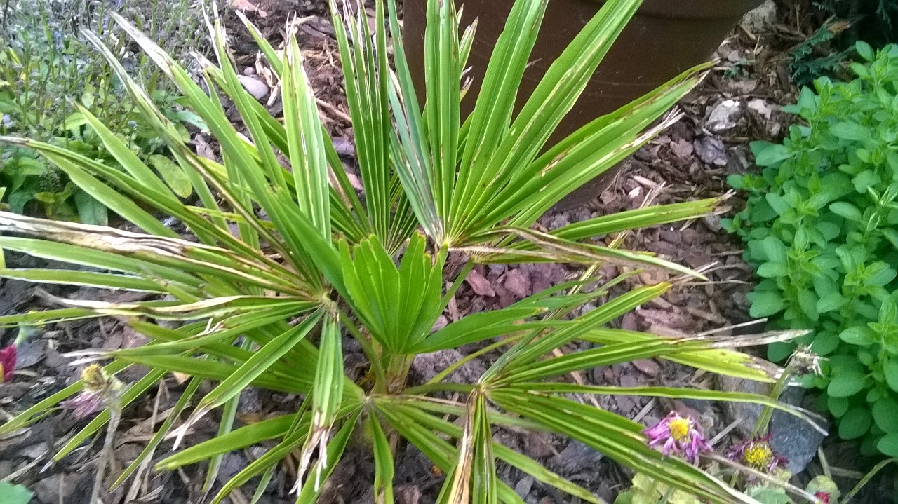 Trachycarpus fortunei "Dalmatia": trachýk, který byl dovezen z Chorvatska v roce 2012. Minulý rok byl vysazen volně venku a zimu 2013/2014 přežil celkem bez problémů.